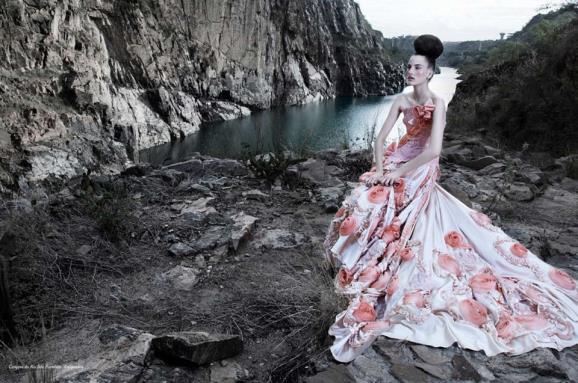 Deslumbrante, a modelo Kate Moss arrasa no vestido de noiva vermelho assinado pela Maison Dior. Tanto a cor quanto o vestido são para noivas com muita personalidade, que não têm medo de ousar. (Foto Tim Walker para Vogue)
